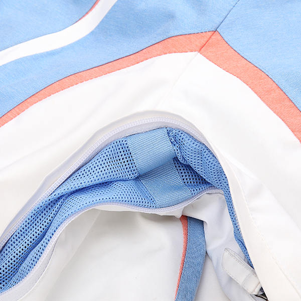 有些沖鋒衣的面料整體如同單層面料,銀灰色為通常的里料顏色,里料連接部位還能看到壓膠條。另外一種沖鋒衣是由獨(dú)立的兩個(gè)分層材料縫制而成,外表層面料是通過把具有防水功能且透氣性良好材料制成有特殊保護(hù)的織物組織結(jié)構(gòu)。此類外表面料的外層起防水透氣作用,內(nèi)層主要起排汗作用。里料層是另一層獨(dú)立的織物,里料和面料是可分開的,里料色彩一般為暗色,主要由錦綸材料、棉纖維之類吸汗材料制成,結(jié)構(gòu)主要以網(wǎng)格為主,面料的拼合部位的壓膠通常會(huì)被里料遮蓋住,只有網(wǎng)格結(jié)構(gòu)的里料才能看到壓膠處。
