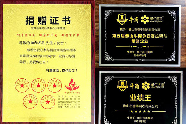 大家看一下下面的獎(jiǎng)項(xiàng)就知道睿牛制衣還是個(gè)不錯(cuò)的良心企業(yè)也是一家有實(shí)力的沖鋒衣生產(chǎn)廠家,我們的總經(jīng)理同時(shí)也是非常有愛心的,她經(jīng)常做善事來匯報(bào)社會(huì),因?yàn)樗?出生在70年代從小的生活也是很艱苦的,他非常能夠理解學(xué)生渴望讀書的那種心情,所以我們老板歐陽月華女士特地愛心參與捐贈(zèng)宜章縣瑤崗仙鎮(zhèn)中心小學(xué)落成,凝聚萬千愛,共圓心學(xué)子夢(mèng)!還有我們總經(jīng)理系上絲帶的照片,讓大家共同把愛傳遞出去!