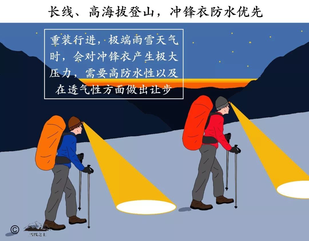 沖鋒衣的防水性與透氣性不可兼得,你在選購(gòu)時(shí),就不能指望買一件“全能型”沖鋒衣,而應(yīng)該根據(jù)自己的戶外活動(dòng)類型來平衡。