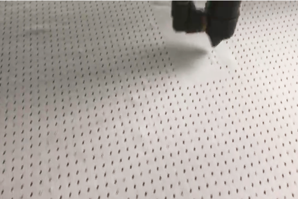 其實簡單來說鐳射就是激光,激光加工技術是利用激光束與物質相互作用的特性對材料進行切割、表面處理、打孔、微加工等,識別物體等的一門技術。而且呢鐳射光束具有高亮度、高方向性、高單色性和高相干性四大特性,所以就給鐳射加工帶來一些其它加工方法所不具備的特性。又由于它是無接觸加工,對材料無直接沖擊,沒有機械變形;在鐳射加工過程中也無“刀具”磨損,無“切削力”,那您定制的沖鋒衣就能保持切割表面光潔美觀了;其次鐳射加工過程中,鐳射光束能量密度高,加工速度快,并且是局部加工,對非鐳射照射部位沒有影響或影響力極小。但是有的沖鋒衣的制作用鐳射機穿孔一個工序就要花上一個半多小時,可以看看下面的圖片,而且我們?yōu)榱吮WC沖鋒衣的質量以免出錯還要專門派人看著,所以說一件沖鋒衣的制作工藝不簡單!