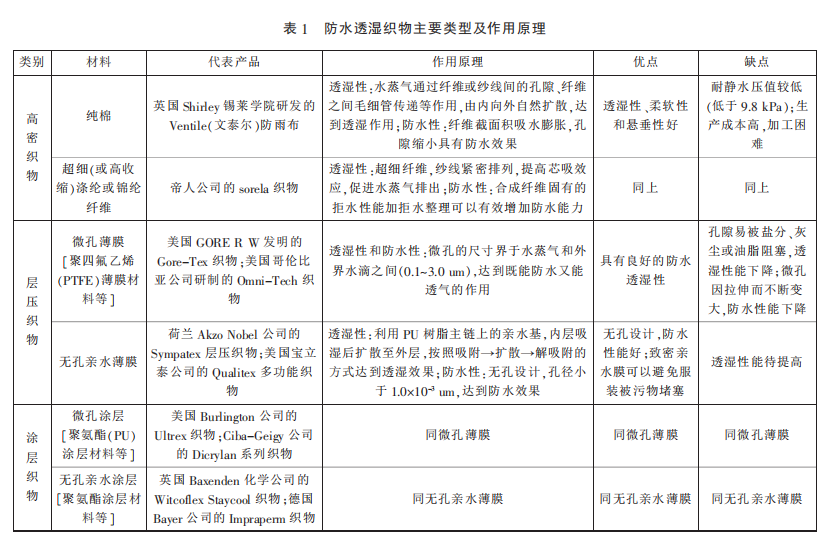 優(yōu)質(zhì)防水透濕面料可以在一定水壓下不被雨水潤濕或滲透,同時將人體散發(fā)的汗液蒸汽擴散或傳導到外界,降低人體微氣候區(qū)的濕度,增強穿著的舒適度和安全性。自1940年,研制出第一個防水透濕織物,目前,防水透濕面料已獲長足發(fā)展。根據(jù)加工工藝,防水透濕面料可分為高密織物、層壓織物和涂層織物,見表1。