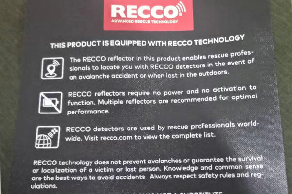 思諾華服飾&睿牛制衣是一家20年主營沖鋒衣、滑雪服的定制生產(chǎn)廠家,20年制作研究戶外服裝,戶外服裝的制作工藝、功能性都要求嚴(yán)格,對(duì)于這一RECCO,它是雪崩救援系統(tǒng)的簡稱,RECCO 是用于定位雪崩受難者的電子系統(tǒng)。