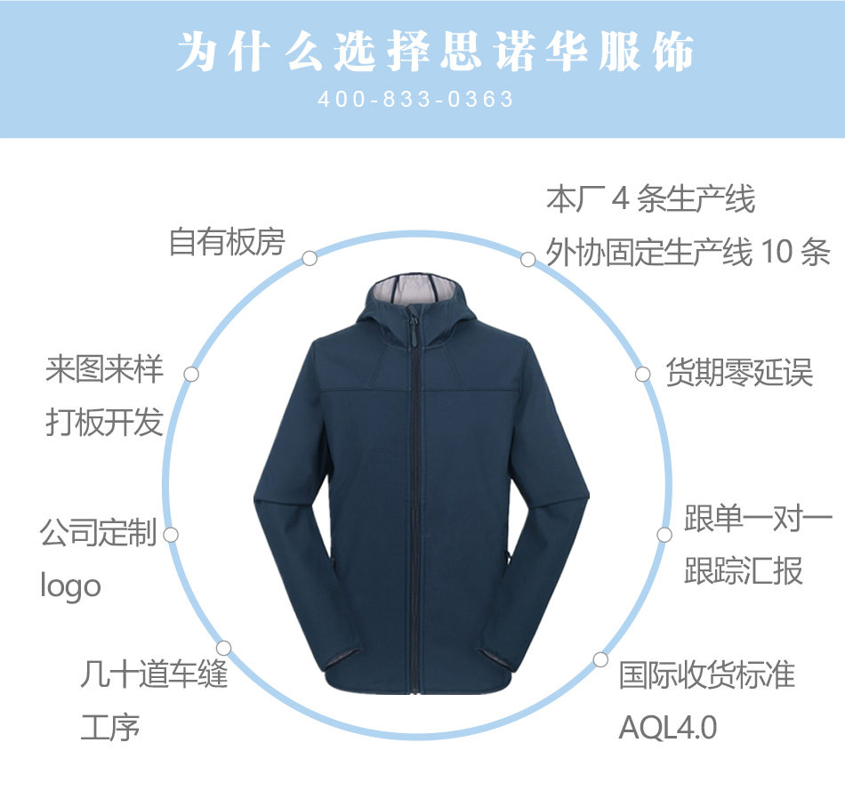 防水面料:采用科技軟殼面料,防風(fēng)鎖溫,穿著柔軟舒適,亦可根據(jù)客戶要求采購功能性面料。