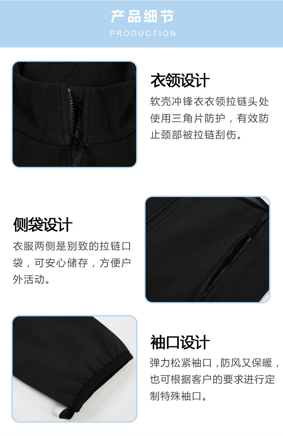 袖口設(shè)計:彈力松緊袖口,防風(fēng)又保暖,也可根據(jù)客戶的要求進(jìn)行軟殼沖鋒衣定制其的特殊袖口。