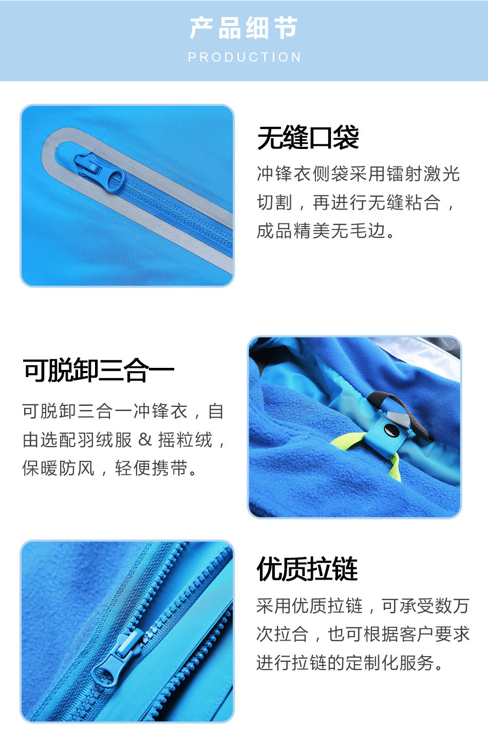 可脫卸三合一沖鋒衣:可脫卸沖鋒衣定制,自由選配羽絨服&搖粒絨,保暖防風(fēng),輕便攜帶。