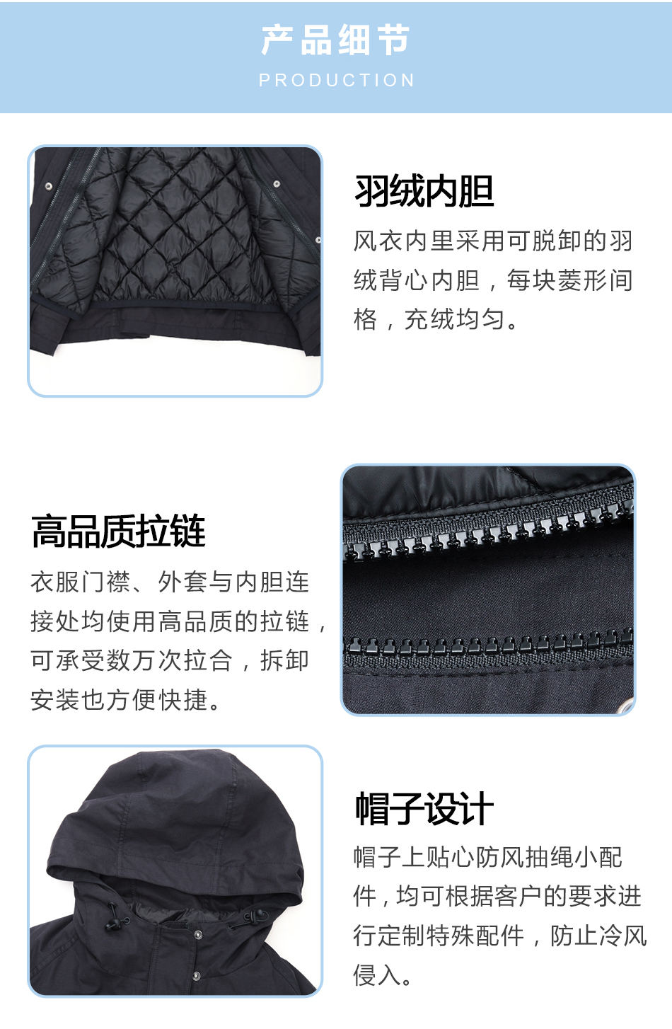 • 帽子設計:帽子上貼心防風抽繩小配件,均可根據(jù)客戶的要求進行戶外風衣套裝定制其特殊配件,防止冷風侵入。