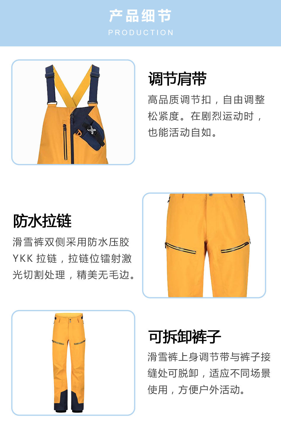 可拆卸褲子:滑雪褲上身調(diào)節(jié)帶與褲子接縫處可脫卸,適應(yīng)不同場景使用,方便戶外活動(dòng)。
