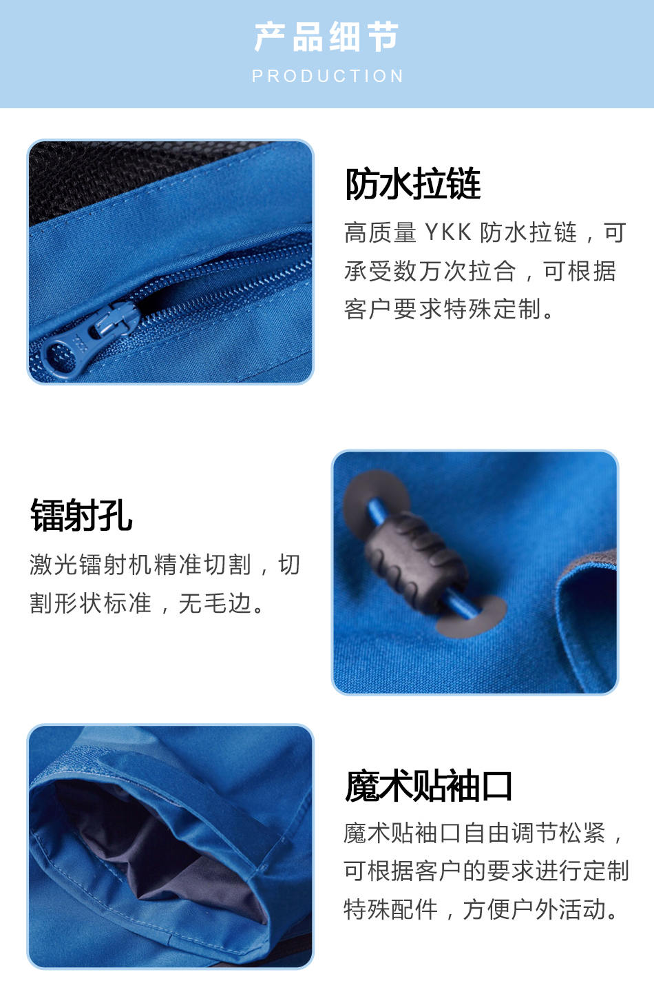 魔術(shù)貼袖口:魔術(shù)貼袖口自由調(diào)節(jié)松緊,可根據(jù)客戶(hù)的要求進(jìn)行定制特殊配件,方便戶(hù)外活動(dòng)。
