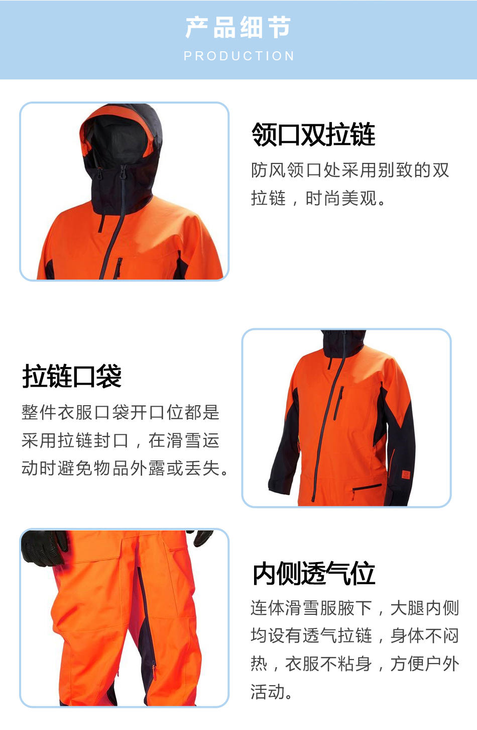 領(lǐng)口雙拉鏈:連體滑雪服的防風(fēng)領(lǐng)口處采用別致的雙拉鏈,時尚美觀。